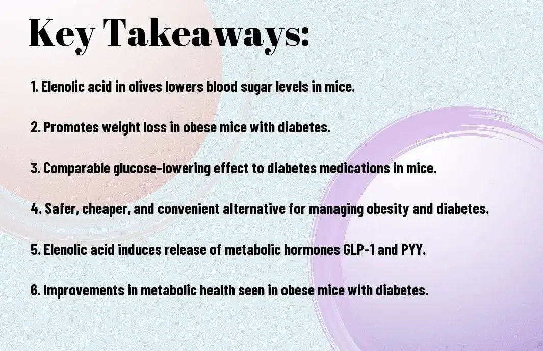 As a reminder, the natural compound found in olives, elenolic acid, has shown remarkable potential in lowering blood sugar levels and promoting weight loss. According to a recent study, obese mice with diabetes who received oral oleanolic acid experienced significant improvements in their metabolic health, including a 10.7% reduction in obesity and better blood sugar regulation. You can learn more about this groundbreaking research and its implications for managing obesity and type 2 diabetes by reading the complete study on Natural compounds found in olives that can lower blood sugar levels and promote weight loss. As you consider incorporating elenolic acid into your health regimen, remember that this natural compound may hold the key to a safer, more effective approach to managing metabolic disorders.